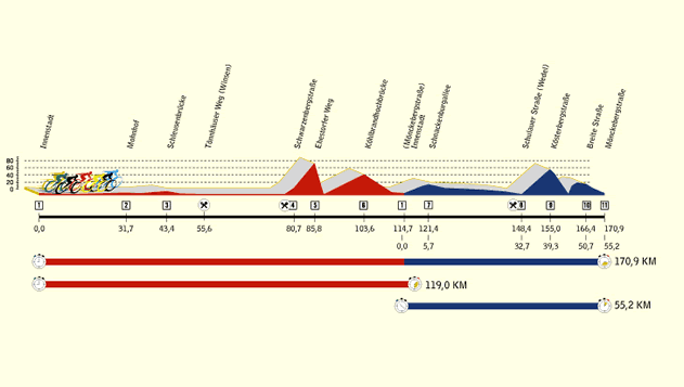 Die Strecke und das Höhenprofil beim HEW. Rot ist die 120km Strecke, schwarz die 55km Strecke und beide zusammen ergeben die 170 km Strecke. | |